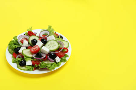 Plate of greek salad on yellow background