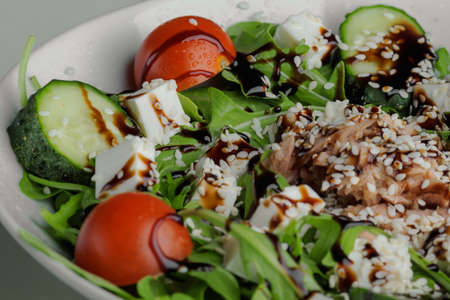 Healthy greens salad on a white plate on a white plate with balsamic sauce, sesame seeds, chicken and arugula