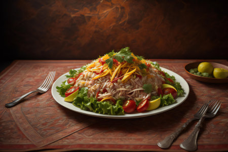 Rice salad with chicken and vegetables on a wooden table. Selective focus. generative ai