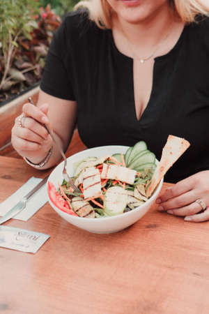 Girl eats popular greek vegetable salad with feta cheese and herbs. Plate with salad on the wooden table in the restaurant. Close up photo of girl with fork in her hands.