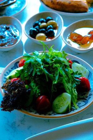 salad plate on blue background. Tasty fresh food. Balanced nutrition