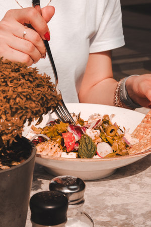 person eating colorful and fresh salad packed with vibrant vegetables at restaurant, healthy eating, nutrition, and wellness concept. High quality photo