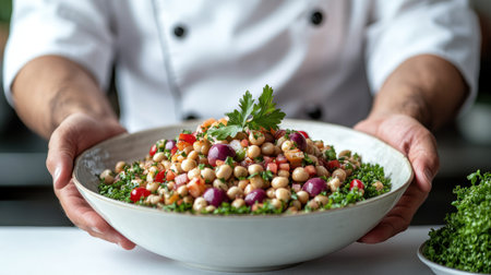 Delicious chickpea salad with colorful vegetables, beautifully served by a chef.