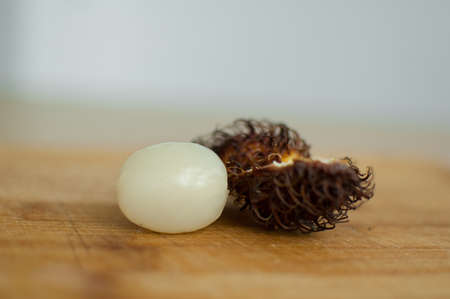 Ripe rambutan on wooden table. Healthy food, fresh organic fruit.