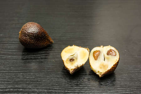 Salak also called snake fruit on a dark wooden substrate.