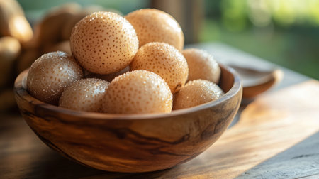 snake fruit lies in a wooden bowl stands on a white background