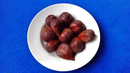 Close up high quality image of whole salacca, fruit composition on blue pastel