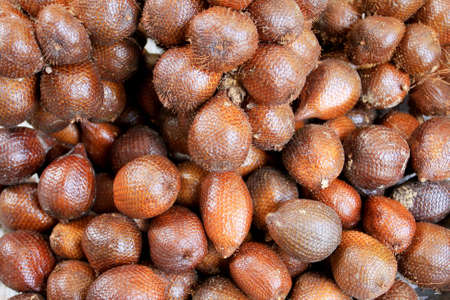 Closeup photo of zalacca pile on shelf. Texture background of fresh ingredient in supermarket.