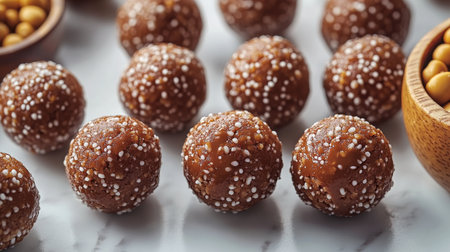 sweets from dried fruits with nuts and sesame seeds Tasty energy balls with dried fruits and nuts in coconut chips on a white plate