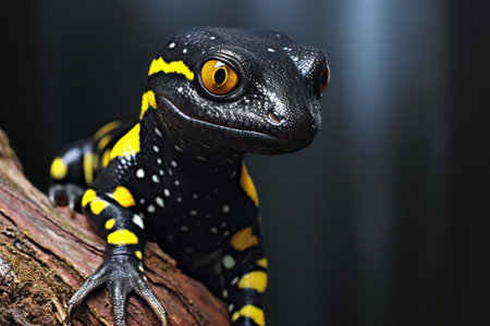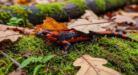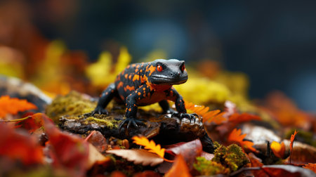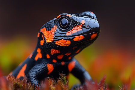 Vibrant black and orange salamander showcasing intricate patterns and textures, set against a blurred natural background. ideal for wildlife photography enthusiasts and nature-themed designs. Generative AI