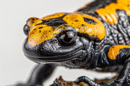 Fire Salamander is seen crawling on a bright white background. Its black skin adorned with striking yellow spots is illuminated in clear lighting highlighting its unique features.