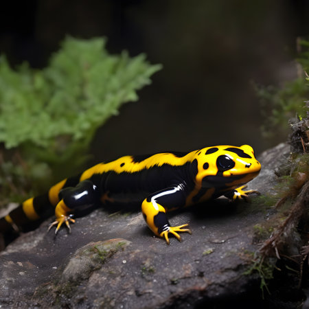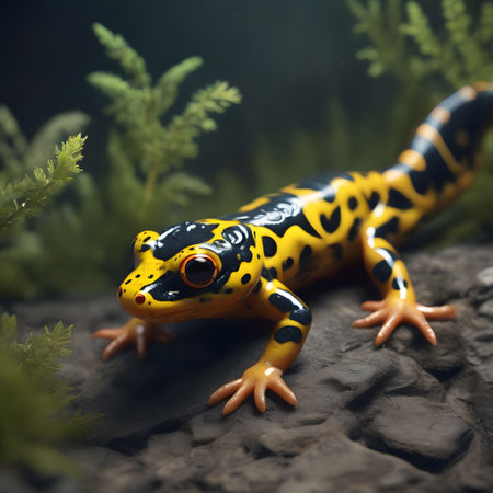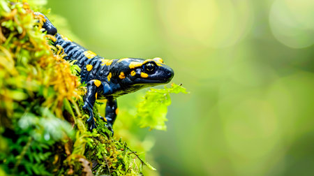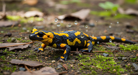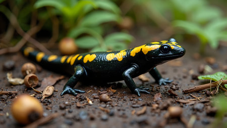Vibrant fire salamander in forest habitat with glossy black skin and bright yellow bands