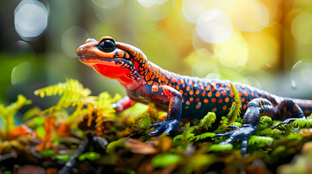 Vibrant Salamander Discovered in Lush Rainforest Nature Scene Close up Macro Shot of Colorful Amphibian Reptile in Tropical Forest Habitat with Moss Leaves and Vegetation