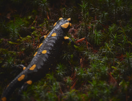 Closeup view of a fire salamander Salamandra salamandra looking sideways while hiding on a moss covered tree trunk in a lush green forest habitat