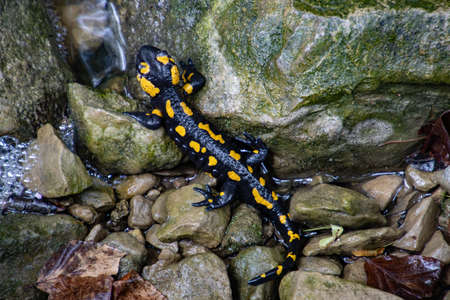 Close up of Fire Salamander crawling through rocks, also called Salamandra salamandra or Fire Salamander