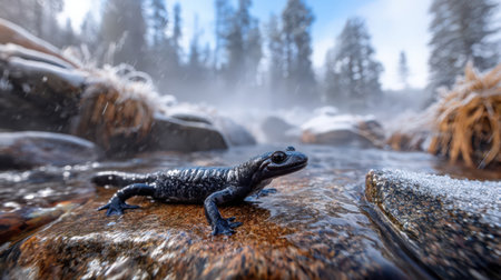 A dark salamander remains on wet rocks by a shallow stream in a frosty forest, showcasing its resilience in a winter landscape.