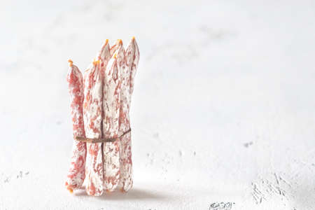 Dry Spanish salami sausage fuet as a snack for the dinner table. Fuet sausage as a food background for your design