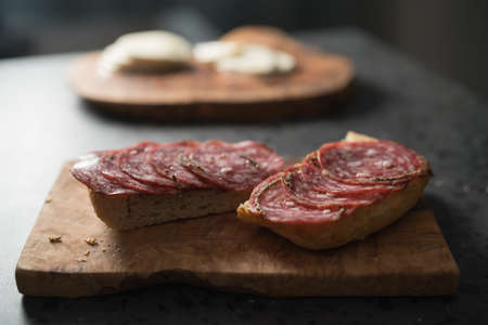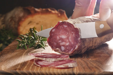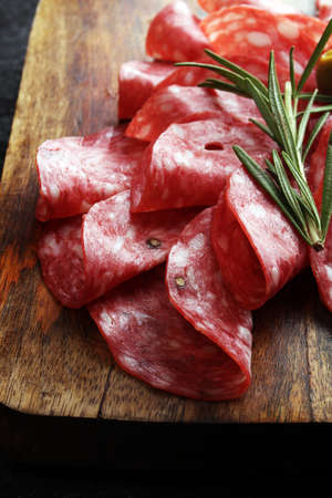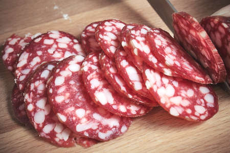 extreme closeup, detailed. salami sausage cut into thin pieces on a wooden board
