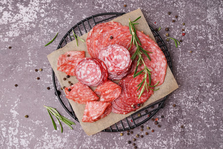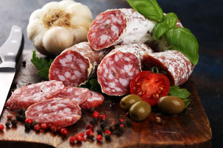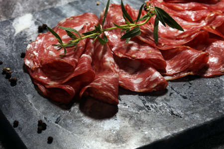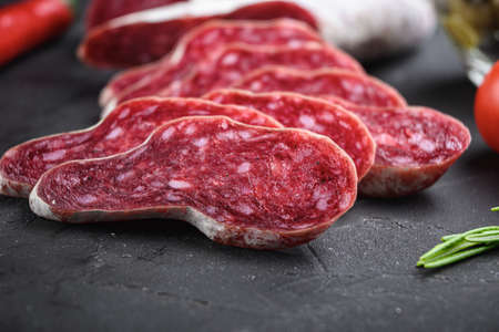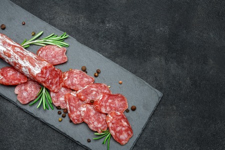 Dried sliced organic salami sausage on stone serving board. dark concrete background