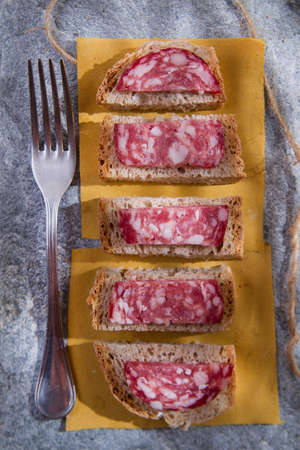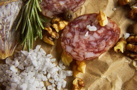 Italian salami wih sea salt, rosemary, garlic and nuts on paper. Rustic style. Top view.