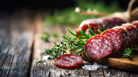 A mouthwatering display of freshly sliced salami accompanied by fragrant herbs on a rustic wooden cutting board, creating an inviting culinary scene.