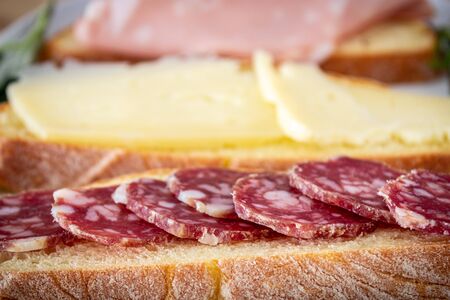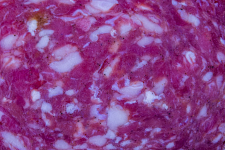 Sliced ​​dry red sausage with fat and slices of ham cut into thin layers.