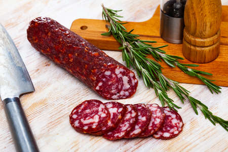 Traditional dry-cured sausage with thyme, garlic, and onion. Dry-cured sausage on a wooden table.