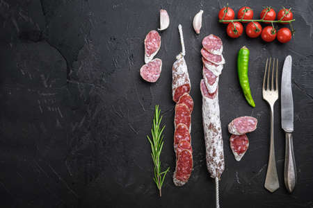 Smoked salami on a black table and a brown board. Sausages with rosemary, garlic and pepper and tomato cherry, dill, parsley