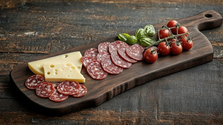 An inviting arrangement of freshly sliced salami and cheese accompanied by ripe cherry tomatoes and fragrant basil, ideal for a charcuterie showcase or culinary feast.