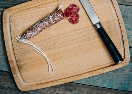 top view smoked sausage, salami, knife on cutting Board, wooden background
