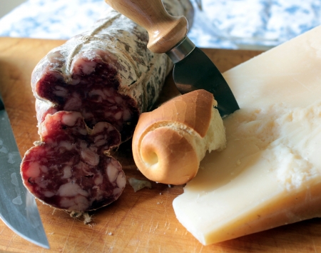 Sliced Spanish sausage fuet salami and vegetables on a domestic kitchen