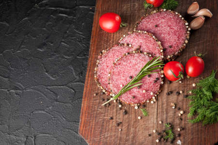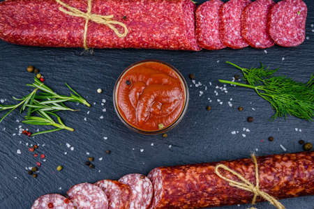 Smoked salami on a black table and a brown board. Sausages with rosemary, garlic and pepper and tomato cherry, dill, parsley