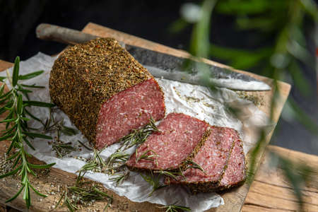 tasty slices salami with rosemary