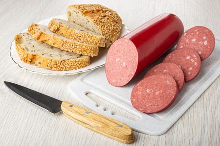 Sliced salami sausage and knife on cutting board. Food idea preparation