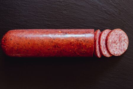 Delicious smoked salami sausage with salt, spices and herbs cut into slices on a dark concrete background