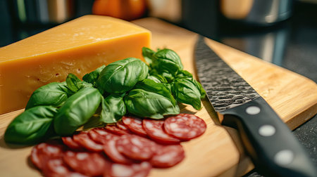A close-up of a chopping board featuring salami, cheddar, and fresh basil leaves, with a knife in the frame.