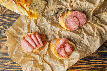 Tasty sandwiches with salami on wooden background
