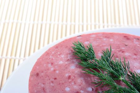 Sausage with small slices of fat in a white plate on a laying from a bamboo.
