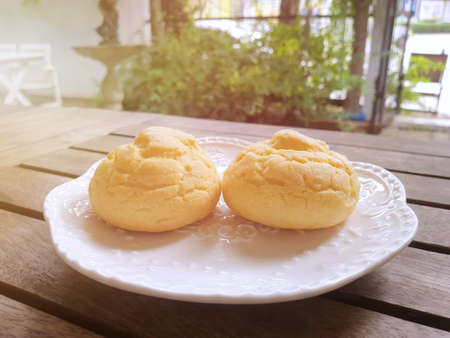 Selective focus of Choux cream in white plate on wooden table with sun shining in café ready to eat (chu cream, Eclair Vanilla cream, cream puff)