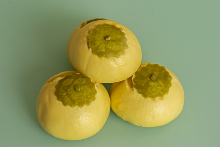 Steamed pork bun on yellow background.