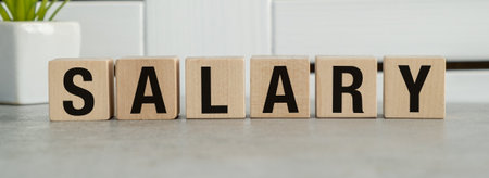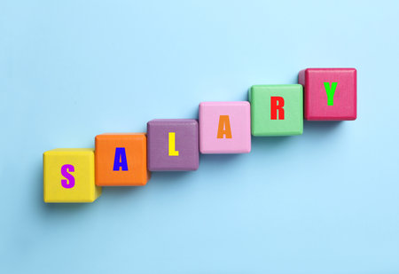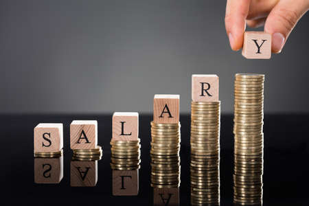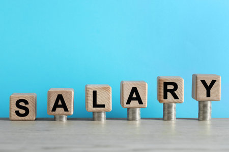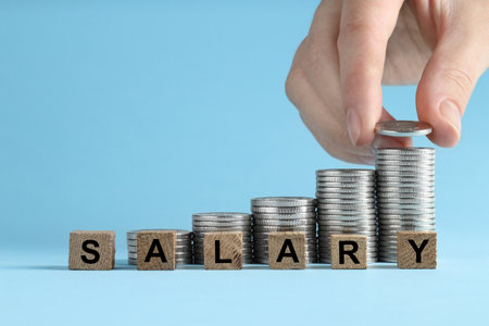 Salary Growth Represented by Stacked Coins and Wooden Blocks Spelling SALARY