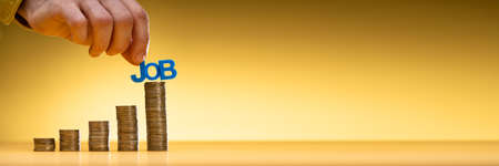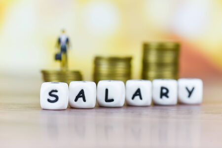 Salary-text inscription on the background of stacks of money coins in ascending order. Chart of financial success of profit strategy planning, promotion, career growth.