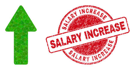Low-Poly polygonal arrow up symbol illustration, and Salary Increase rubber seal imitation. Red stamp seal contains Salary Increase title inside circle shape. Arrow up icon is filled using triangles.
