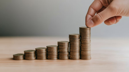 Hand placing a coin on a progressively increasing stack of coins, representing the concept of investment growth, savings, and financial success