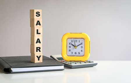 Salary text on wooden block cube, on top of notepad and next to calculator and clock.