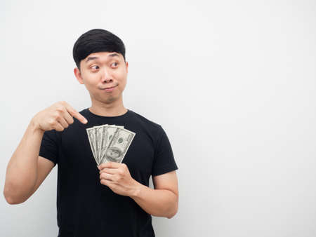 Man point finger at money in hand and looking at copy space