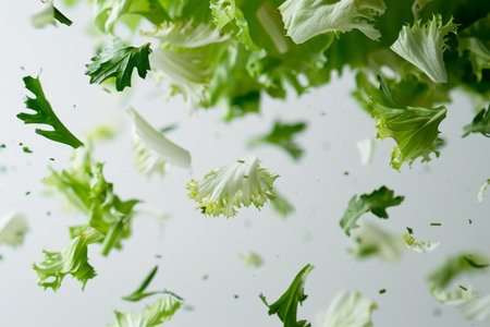 Fresh, Vibrant Green Romaine Lettuce Leaves Cascading and Floating on a Clean White Background