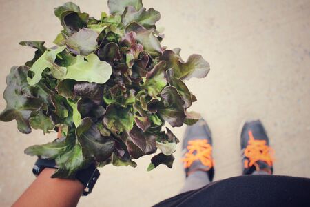 Closeup of a bunch of fresh, organic green salad, lettuce made without nitrates in the market for fruit and vegetables. Concept health, agriculturally.