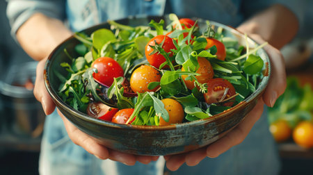 Fresh salad bowl with tomatoes and greens, person holding, vibrant