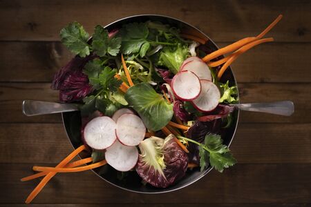 Fresh mix vegetable salad in metal plate with olive oil dressing on rustic wooden background. Purple and green lettuce, parsley, slised carrot, radish, spinach. Organic food concept. Top view